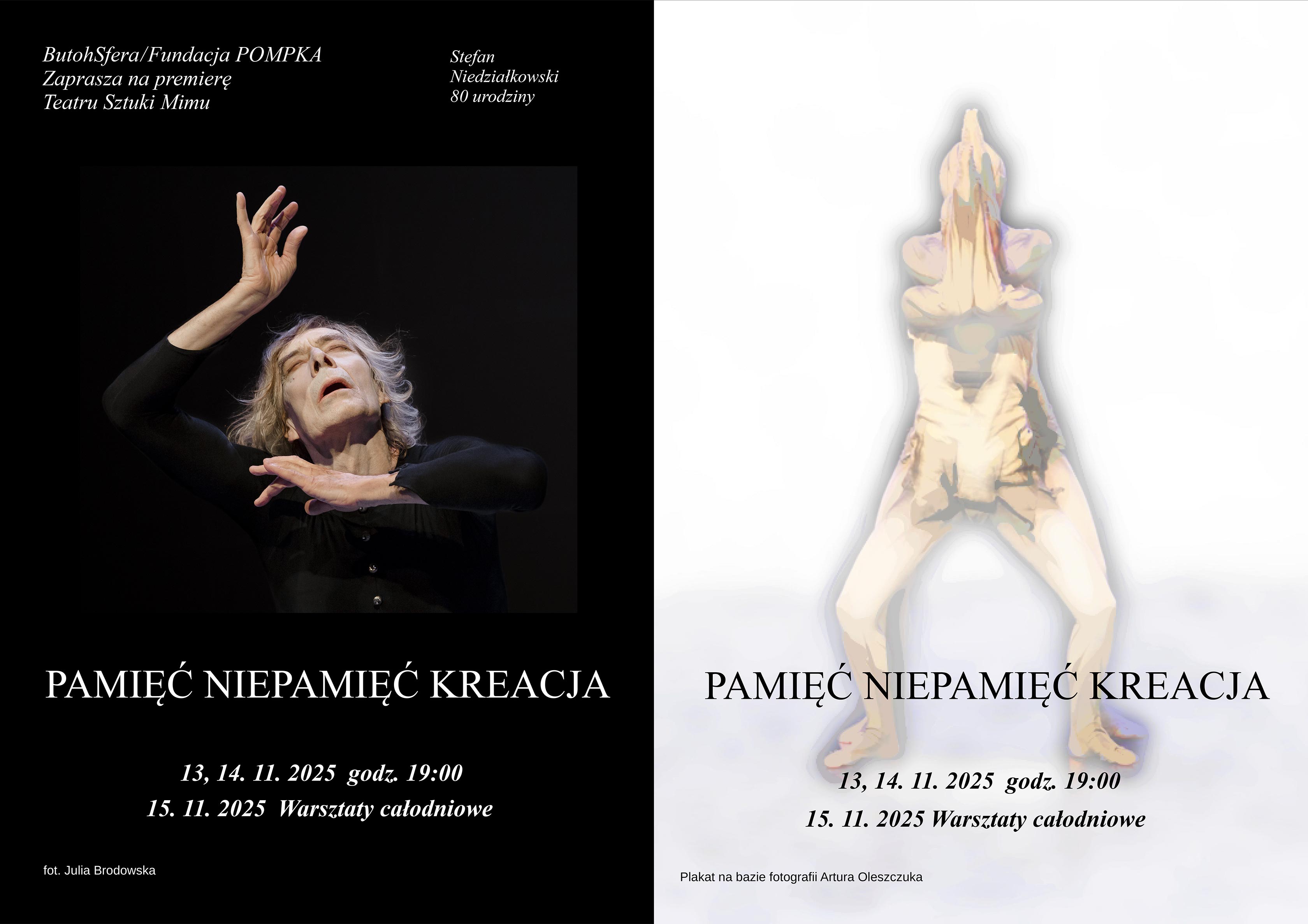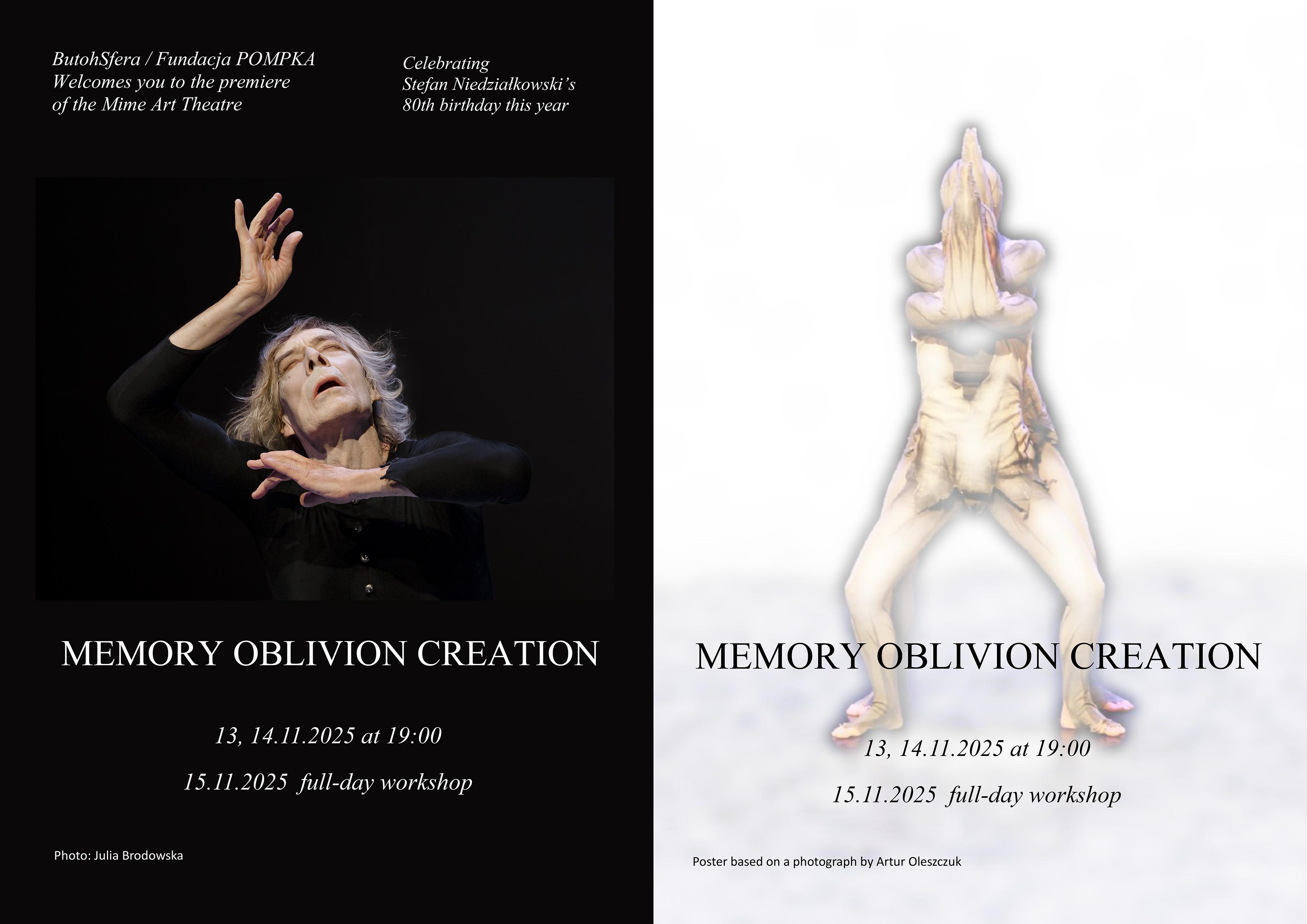 "Oko nigdy nie zapomina, tego, co zobaczyło serce." —BANTU Fragmenty różnych spektakli naszego Teatru Sztuki Mimu ciągle są żywe i wyraziste w mojej wyobraźni. To właśnie te niezapomniane obrazy stały się inspiracją do stworzenia premiery ''Pamięć Niepamięć Kreacja" Znakomita muzyka, która w przeważającej większości była tworzona specjalnie do naszych spektakli zaistnieje również w obecnej premierze. W naszym Teatrze Sztuki Mimu aktora mima nazywam Milczącym Aktorem Twórcą, ponieważ świadomie rezygnuje ze słów, aby dotrzeć do samej istoty tego, co tak trudno wyrazić poprzez słowa. Zmieniające się myśli, przeżycia emocjonalne, wewnętrzne postawy jak w lustrze ukazują się w ciele artysty. On sam staje się instrumentem dramatycznego wyrazu w celu odzwierciedlenia uniwersalnej prawdy. Wielka i doniosła to chwila, kiedy artyści w teatrze wchodząc na scenę,wkraczają do świątyni sztuki ukrytej w ich wnętrzu. Jako milczący aktorzy muszą się teraz stać twórcami, ale także i dziełem które tworzą. Niepojęte są przeżycia i doznania artysty, który próbuje ukazać nam obraz z niewidzialnych przestrzeni. Odszukanie takiego obrazu w sobie i wydobycie go z głębin jest pragnieniem wyrażenia najskrytszej prawdy istniejącej w świadomości człowieka. Jeżeli powiemy że nasz Teatr Sztuki Mimu jest teatrem ruchu to trzeba pamiętać, iż ruch ten, nie jest już ruchem, lecz widzialną transformacją myśli i przeżyć emocjonalnych. Spektakl nasz, "Pamięć Niepamięć Kreacja" składa się z pięciu różnych obrazów ukazujących, każdy w inny sposób, człowieka i jego świat wewnętrzny—niewidzialny na co dzień, lecz jak ważny w życiu człowieka. Ten świat ukryty jest w milczeniu ludzkiej duszy. Chciałbym bardzo podziękować Anicie Zdrojewskiej, prezesce Fundacji POMPKA i twórczyni BUTOHSFERY, za możliwość pokazania tak ważnej dla mnie Premiery. Kończąc w tym roku 80 lat, mam wielki zaszczyt i przyjemność występować z moim zespołem w tym wyjątkowym miejscu, jakim jest BUTOHSFERA. Dziękuję również dyrektorce Teatru Ochoty, Joannie Nawrockiej, za wielokrotne stwarzanie mi warunków do przygotowywania premier. Stefan Niedziałkowski